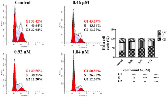 6 induced HeLa cell cycle arrest in G1 phase. HeLa cells were fixed with 70% ethanol after 48 h administration of 6 (0, 0.46, 0.92 and 1.84 µM). PI staining was performed after RNase A treatment, and red fluorescence at the excitation wavelength of 488 nm was recorded by flow cytometry. Data are represented as mean ± SD of three independent experiments. ** p < 0.01, *** p < 0.001, **** p < 0.0001, ns—not significant.