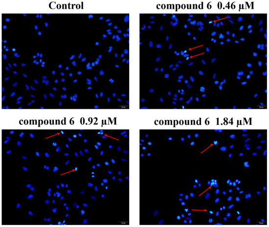 Deviant morphological characteristics such as pyknosis and nuclear fragmentation often occur in the early stage of apoptosis. As shown in Figure 3, Hoechst33258 staining result showed that with the increase of 6 (0, 0.46, 0.92 and 1.84 µM), the bright spots with higher fluorescence intensity gradually appeared in the HeLa cells, indicating the occurrence of nuclear fragmentation. Hoechst33258 staining indicated that 6 induced HeLa cell apoptosis.