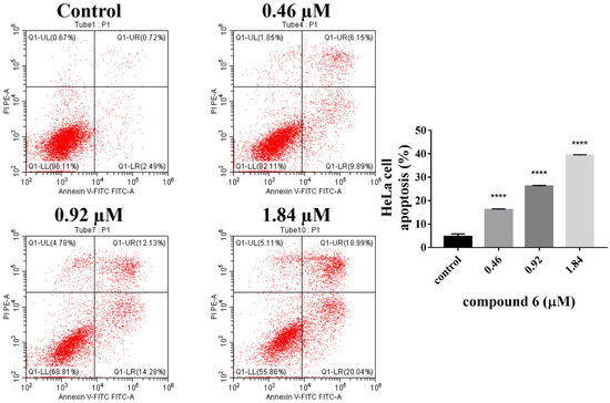 6 induced apoptosis in HeLa cells. HeLa cells were collected by 0.25% trypsin (without ethylenediaminetetraacetic acid (EDTA)) digestion after 48 h administration of 6 (0, 0.46, 0.92 and 1.84 µM). Annexin V-FITC and PI were added successively in dark for 15 min, and apoptosis was detected by flow cytometry. Data are represented as mean ± SD of three independent experiments. **** p < 0.0001.