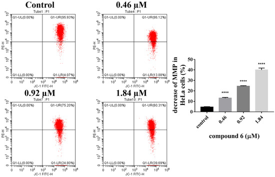6 induced the decrease of mitochondrial membrane potential in HeLa cells. Cells were collected by 0.25% trypsin (without EDTA) digestion after 48 h administration of 6 (0, 0.46, 0.92 and 1.84 µM). HeLa cells were suspended in a mixture of 1×Incubation Buffer and JC-1, and incubated for 20 min. The fluorescence changes of JC-1 were detected by flow cytometry. Data are represented as mean ± SD of three independent experiments. **** p < 0.0001.