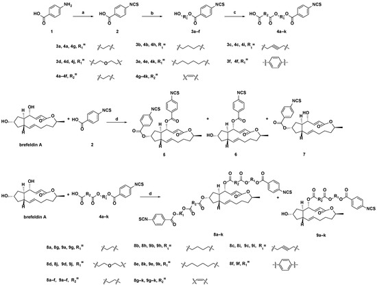 The synthesis strategy of the target compounds is shown in Scheme 1. 4-Carboxyphenyl isothiocyanate 2 was synthesized by the reaction of 4-aminobenzoic acid with 1,1′-thiocarbonyldiimidazole in the mixture of anhydrous dichloromethane (DCM) and triethylamine (TEA). Under the catalysis of 4-dimethylaminopyridine (DMAP) and N-(3-dimethylaminopropyl)-N’’-ethylcarbodiimidehydrochloride (EDCI), 4-carboxyphenyl isothiocyanate reacted with ethylene glycol, 1,4-butanediol, 2-butyne-1,4-diol, diethylene glycol, 1,6-hexanediol and hydroquinone in DCM at room temperature to obtain intermediates 3a–f. 3a–f were reacted with succinic anhydride or maleic anhydride at room temperature in the presence of DMAP and TEA in DCM to obtain intermediates 4a–k. The intermediates 2 and 4a–k were dissolved in DCM, and EDCI, DMAP and BFA were added in turn to obtain the target derivatives 5, 6, 7, 8a–k and 9a–k at room temperature.