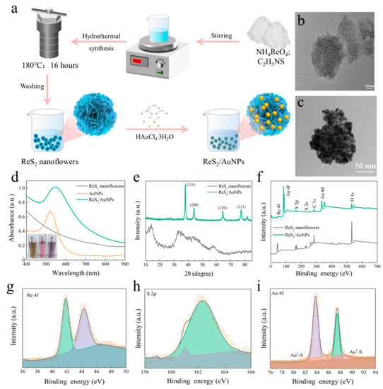 Figure 2a shows the preparation process for the ReS2/AuNPs complexes. In order to uniformly attach the appropriate amount of AuNPs to the ReS2 nanoflowers without using a reducing agent, a large specific surface area and strongly catalytic properties of ReS2 nanoflowers were prepared via a hydrothermal synthesis at a temperature of 180 °C for 16 h. Then, under constant temperature at 80 °C, upon the addition of a certain concentration of HAuCl4 solutions, the color of the mixed solution gradually changed from pale yellow to deep purple (as illustrated in Figure 2d), indicating the successful reduction of AuNPs and synthesis of the ReS2/AuNPs complexes. Figure 2b,c display the transmission electron microscopy (TEM) images of the ReS2 nanoflowers and ReS2/AuNPs composites at appropriate magnification voltages ranging from 40 to 120 kV. The results show that the flower-like ReS2 has an average particle size of 49.5 nm, which uniformly adhered in parallel without stacking and dispersed homogeneously, as shown in Figure S1. The three-dimensional surface area of the ReS2 nanoflowers provides a number of adsorption sites for AuNPs, resulting in the reduced AuNPs being grown uniformly on its surface (shown in Figure 2c).