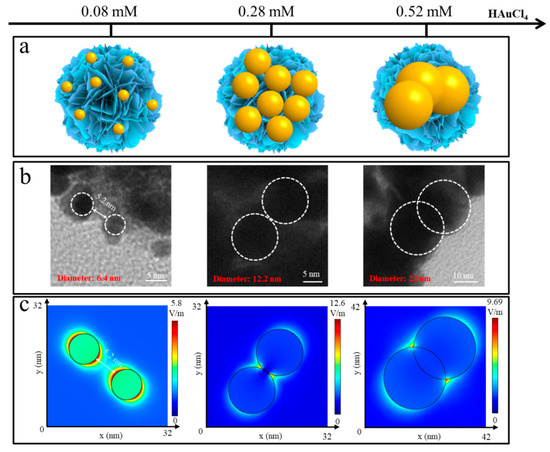 (a) Diagram of ReS2/AuNPs with different AuNPs sizes. (b) TEM images of AuNPs with varying sizes and gaps. (c) Electric field intensity distribution corresponding to (b). Gradient color bar indicates the electric field intensity of E/E0.