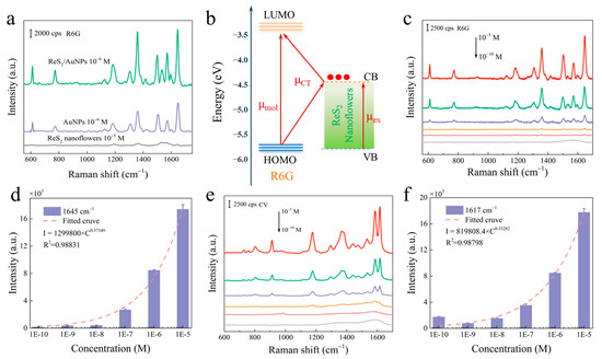 Under optimized conditions, the enhanced sensing performance of ReS2/AuNPs as a SERS substrate was verified by detecting R6G and CV dye molecules. First, 10−5, 10−6, and 10−6 M concentrations of R6G solutions were soaked with ReS2 nanoflowers, AuNPs, and ReS2/AuNPs, respectively, for 1 h. After natural drying, SERS measurements were performed under the 514 nm excitation light. Figure 4a shows that the R6G Raman characteristic peaks at 611, 773, 1360, 1510, and 1645 cm−1 were detected for the ReS2 nanoflowers, AuNPs, and ReS2/AuNPs SERS substrates [46]. Notably, the ReS2 nanoflowers as a semiconductor SERS substrate could detect capable 10−5 M R6G, which is attributed to the CM of the ReS2 nanoflowers and the abundance of active sites. According to a previous study, the conduction band minimum (CBM) and valence band maximum (VBM) of the bilayer ReS2 were −4.46 and −5.86 eV, respectively [47]. The highest occupied molecular orbital (HOMO) energy levels and the lowest unoccupied molecular orbital (LUMO) energy levels of R6G were −5.7 and −3.4 eV, respectively [48]. When the excitation light irradiated the ReS2 nanoflowers surface, the electrons of VBM jumped to the CBM [49] and were rapidly transferred to the LUMO of the R6G dye molecules (Figure 4b), which makes the R6G dye molecules obtain a CM order-of-magnitude SERS enhancement.