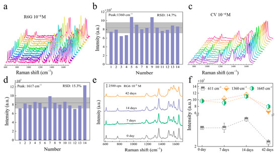 An ideal SERS sensor requires high sensitivity, as well as great repeatability and stability of the substrate. Therefore, to evaluate the repeatability of ReS2/AuNPs complexes, 14 detection sites were randomly selected from the substrate with adsorbed 10−6 M R6G and CV, as shown in Figure 5a,c. The results show that the SERS spectra of both R6G and CV exhibit consistent Raman characteristic peaks similar to those shown in Figure 4. In addition, the Raman signal intensities were relatively consistent. Figure 5b,d present the relative standard deviation (RSD) of the Raman peaks at 1360 cm−1 and 1617 cm−1 for R6G and CV in Figure 5a,c, respectively. The results demonstrated that the RSD of R6G and CV was 14.7% and 15.3%, respectively, suggesting great repeatability on the ReS2/AuNPs substrate. In addition, Figure 5e displays the SERS spectra obtained by testing the ReS2/AuNPs substrate adsorbed with R6G dye molecules, which was stored in the dark at room temperature, with measurements taken at seven-day intervals. The results show that the Raman signal intensity of RG6 did not significantly change even after the substrate was stored for more than a month, and the position of the peaks is not shifted in any way. Figure 5f demonstrates that the peak intensities of 6RG at 611 cm−1, 1360 cm−1, and 1645 cm−1 did not show any significant decrease after 14 days. Even after 42 days, only a minimal decline was observed. This indicates the high stability of the ReS2/AuNPs SERS substrate.