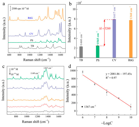 (a) SERS spectra of ReS2/AuNPs substrate detecting 10−6 M cationic dyes (R6G, CV) and anionic dyes (PS, TB). (b) The intensity histograms of the Raman characteristic peaks for cations and anions. (c) SERS spectra of different concentrations of TTD solutions from the ReS2/AuNPs substrate detection. (d) Relationship between concentrations of TTD solutions and SERS signal intensity.