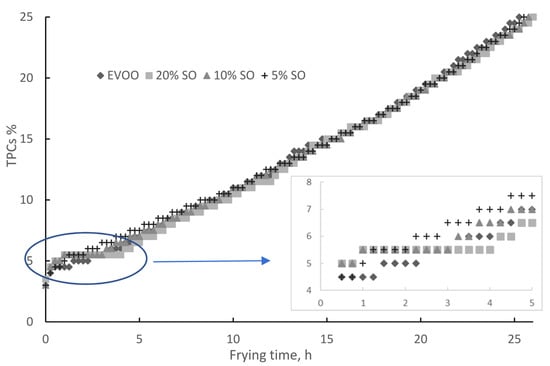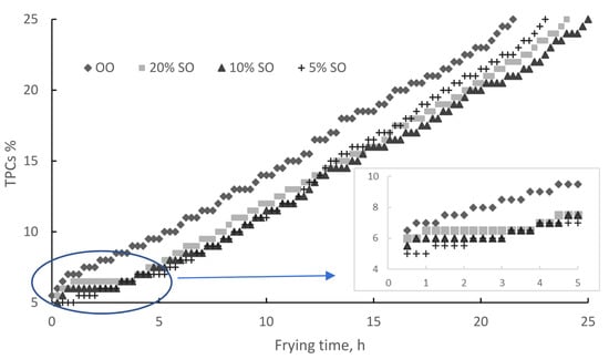 The EVOO frying time was not increased by SO blending and was approximately the same (25–26 h) for all blends. This is due to the higher antioxidant content of EVOO, indicating the higher nutritional value and health benefits of EVOO in comparison to OO. The TPC formation rate for EVOO did not decrease upon the addition of SO; it was always 1% per hour. A slight delay in the formation of TPCs upon 10 and 20% SO addition to EVOO was also detected, while 5% had no effect. After this delay, TPCs increased at a steady rate of 1% per hour (Figure 2).