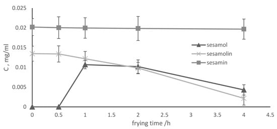 Large amounts of sesamol are produced from sesamolin during frying, contributing to oil stability [,]. Chatzos and Georgiou [] reported that radical scavenging activity increases during virgin sesame oil heating, in contrast to all other seed oils in their study. This paradox is attributed to the fact that sesamol has higher antioxidant activity than its precursor, sesamolin []. We followed the decomposition of sesamolin to sesamol during the domestic deep frying of potatoes in admixtures with olive oil through reverse-phase HPLC. Initially, only sesamin and sesamolin were detected (Figure 3). After 1h of frying, sesamol was detected and sesamolin decreased by 18%. After 2 h of deep frying, both sesamol and sesamolin decreased by 5% and 38%, respectively. After 4 h, sesamol and sesamolin decreased further by 60% and 70%, respectively. A similar study on sesame oil by Hemalatha and Ghafoorunissa is in accordance with our study, reporting the maximum concentration of sesamol after one hour followed by a gradual decrease for one more hour [].