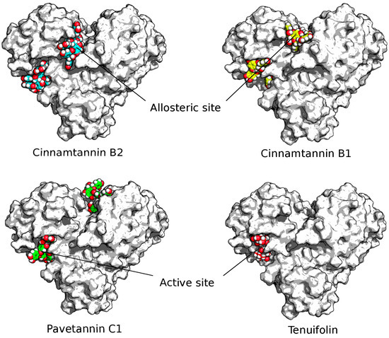 Inhibition of SARS-CoV-2 main protease active and allosteric sites by bioactive ligands. The SARS-CoV-2 main protease (Mpro) is depicted as a gray surface, while Cinnamtannin B1, Cinnamtannin B2, Pavetannin C1, and Tenuifolin are shown (colored by element) as yellow, blue, green, and red spheres, respectively, interacting with both active and allosteric sites. Figure 1 clearly displays the Mpro–ligand complexes, which were visualized using the PyMOL molecular visualizer software (Version 1.3r1) [33]. Notably, several ligands, including Tenuifolin and Procyanidin C1, exhibited remarkable potential for blocking Mpro enzymes, as outlined in Table 2.