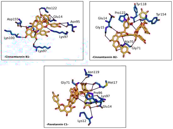 Intriguingly, the homodimeric structure of the target protein revealed a significant free binding energy in its concave region. Specifically, Cinnamtannin B1, Cinnamtannin B2, and Pavetannin C1 exhibited free binding energies of −11.12, −10.74, and −10.79 (kcal/mol), respectively, within this region. Further analysis showed that these ligands established several hydrogen-bond interactions with specific amino acids of the Mpro group, including Glu14, Asn95, Lys97, Lys100, Pro122, and Asp155 for Cinnamtannin B1, Glu14, Gly15, Ala70, Gly71, Ser121, and Tyr154 for Cinnamtannin B2, and Glu14, Met17, Gly71, Lys97, and Asn119 for Pavetannin C1. This indicates that these ligands possess high affinity and stability towards the target protein and can form stable complex conformations via their active catalytic pocket sites, making them promising candidates for further investigation.