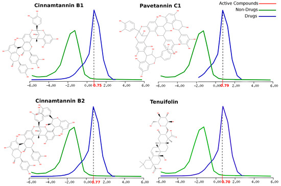 The main bioactive molecules present in the proposed EO mixture of ImmunoDefender experimental products were carefully selected for further analysis. In order to predict their molecular properties and drug-likeness features, an overall drug-likeness score was computed for each compound based on several molecular property values. As a result, Cinnamtannin B1, Cinnamtannin B2, Pavetannin C1, and Tenuifolin were found to have drug-likeness scores of 0.75, 0.79, 0.79, and 0.70, respectively (as shown in Table 4). Figure 3 illustrates how these score values conform to commercialized drug active molecules with a high level of tolerance and efficiency.