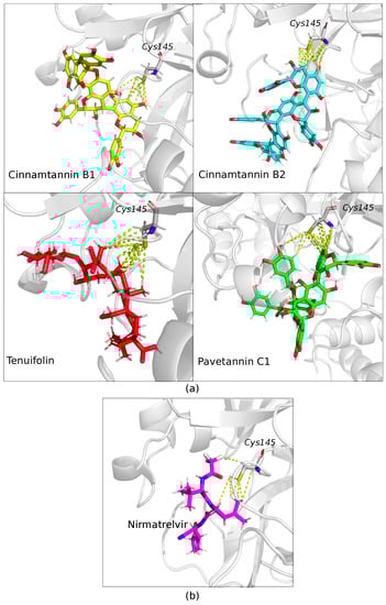 Comparison of binding interactions between ImmunoDefender’s main ligands and Nirmatrelvir, the active component of the anti-COVID-19 drug Paxlovid, with the catalytic pocket of Mpro. The structure of Mpro is depicted as a transparent cartoon, while the ligands and Cys145 residue are shown as sticks. The yellow dashed lines indicate the interactions between the ligands and the catalytic pocket of Mpro. (a) ImmunoDefender’s main ligands establish polar, hydrophobic, and hydrogen bond contacts with the catalytic pocket of Mpro. The figure highlights the essential role of the Cys145 residue, which is marked in the figure, in facilitating these interactions. (b) Illustration of the interaction between Nirmatrelvir, the chemical ligand of the anti-COVID-19 drug Paxlovid, and the Cys145 residue of Sars-Cov-2 Mpro. This figure underscores the significant contribution of the Cys145 residue to the catalytic activity of Mpro and its potential as a target for the design of anti-COVID-19 drugs.