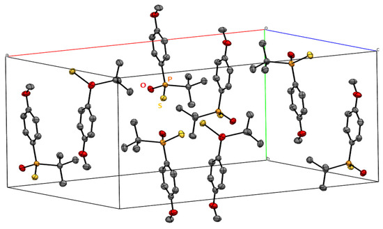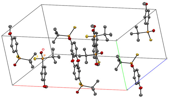 The unit-cell assembly of (Sp)-tert-butyl-(4-methoxyphenyl) phosphinothioic acid 1a. An asymmetric unit consists of two compound molecules. The thermal ellipsoids are drawn with 50% probability.
