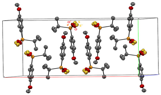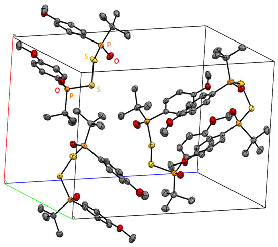 Both enantiomers of tert-butyl-(4-methoxyphenyl)phosphinothioic acid, (Sp)-1a (CCDC accession code 1509139; Figure 1) and (Rp)-1a (CCDC accession code 1589363; Figure 2), were crystallized in the monoclinic system, in space group C2, with the presence of two independent compound monomers in the respective asymmetric units. Racemic tert-butyl-(4-methoxyphenyl)phosphinothioic acid, (rac)-1a (Figure 3), is monoclinic and crystallizes in space group C2/c, with the presence of a single monomer in the asymmetric unit. This monomer shows disorder, i.e., the presence of two different positions of the O and S atoms (see Figure 3). The occupancies of the two disordered O and S atoms were 0.75 and 0.25 (also see “Figure 2” in [31]). The disulfide form of tert-butyl-(4-methoxyphenyl)phosphinothioic acid, bis-(Sp)-1a (CCDC accession code 1589336; Figure 4), was crystallized in the orthorhombic system, and the space group was P212121 (Table S1—see Supplementary Materials). The entire disulfide has been found in the asymmetric unit (see Figure 4).