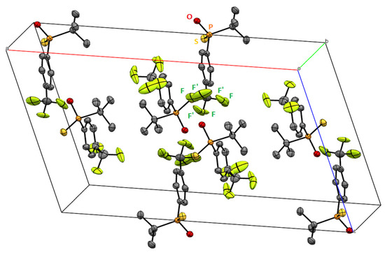 These two determined structures of tert-butyl-(4-trifluoromethylphenyl)phosphinothioic acid 1b, (Rp)-1b and (rac)-1b, are not similar (not isostructural) to the respective structures of tert-butyl-(4-methoxyphenyl)phosphinothioic acid 1a. The asymmetric unit of tert-butyl-(4-trifluoromethylphenyl)phosphinothioic acid (Rp)-1b consists of two independent molecules, both with the absolute configuration, R, at the phosphorus atoms. Only, in this case, these two monomers formed a homodimer which lies entirely in an asymmetric unit (see “Figure 4” in [31]), whereas, for tert-butyl-(4-methoxyphenyl)phosphinothioic acid (Rp)-1a, the dimer has to be built by applying the respective symmetry operations to each of the two molecules from the asymmetric unit (see “Figures 2 and 3” in [31]). For tert-butyl(4-trifluoromethylphenyl)phosphinothioic acid (Rp)-1b, only such homodimer as that seen in “Figure 4” in [31] serves as a building block for the entire crystal lattice.