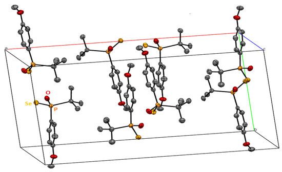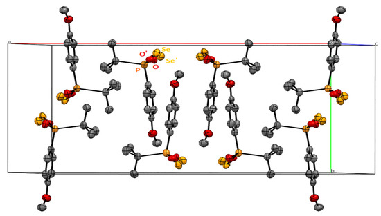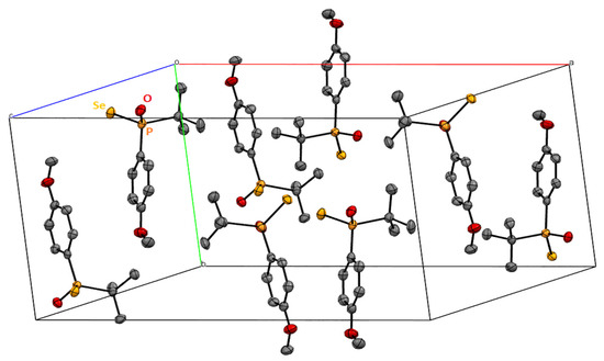 We found that all three tert-butyl-(4-methoxyphenyl)phosphinoselenoic acids, (Sp)-2a, (Rp)-2a, and (rac)-2a (see Figure 7, Figure 8 and Figure 9), are isostructural with the respective sulfur-containing counterparts (see Figure 1, Figure 2 and Figure 3). The comparison of the unit-cell dimensions (a, b, c, and volume) in Tables S1 and S2 showed the longer lengths of the unit-cell dimensions (a, b, c) and the larger values of the unit-cell volumes for phosphinoselenoic acids than in the respective sulfur-containing compounds. Obviously, the consequent increase of the unit-cell parameters and volumes was due to the presence of a larger atom, i.e., selenium in comparison to sulfur.