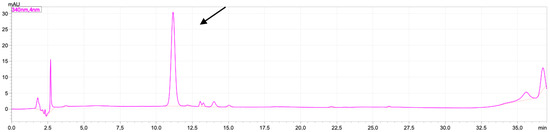 Chromatogram of standard rutin 10 ppm mobile phase containing H2O-acetonitrile in 0.1% of TFA. Separation column: monolithic column C18 (4.6 × 150 mm I.D.); injection loop: 20 μL; flow rate: 1.5 mL/min; temperature 30 °C; detection by absorbance at 340 nm; black arrow shows the peak of rutin (11.5 min).