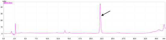 Chromatogram of standard luteolin 20 ppm mobile phase containing H2O-acetonitrile in 0.1% of TFA. Separation column: monolithic column C18 (4.6 × 150 mm I.D.); injection loop: 20 μL; flow rate: 1.5 mL/min; temperature 30 °C; detection by absorbance at 340 nm. Black arrow shows the peak of luteolin (22.1 min).