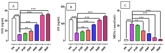 The effect of VAEE on serum level of SOD (A), GR (B), and MDA (C). (KN: normal rats, Doxo: doxorubicin 15 mg/kgbw, P100: 100 mg/kgbw + doxorubicin, P200: 200 mg/kgbw + doxorubicin, P400: 400 mg/kgbw + doxorubicin, P600: 600 mg/kgbw + doxorubicin, P800: 800 mg/kgbw + doxorubicin). (**: p < 0.01, ***: p < 0.001).