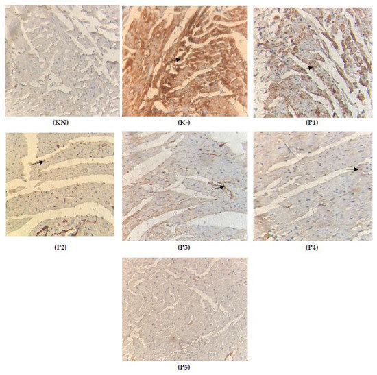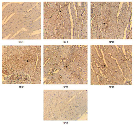Histology of cardiac-tissue-stained apoptosis (KN: normal rats, K-: doxorubicin 15 mg/kgbw, P1: 100 mg/kgbw + doxorubicin, P2: 200 mg/kgbw + doxorubicin, P3: 400 mg/kgbw + doxorubicin, P4: 600 mg/kgbw + doxorubicin, P5: 800 mg/kgbw + doxorubicin; the arrows show the yellow color of the expression of TGFβ).