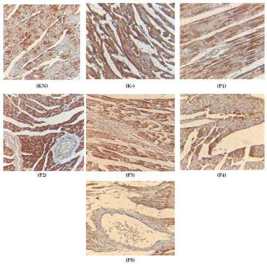 Rats were split into six random groups of five. Group 1 received CMC-Na orally for eight days (KN), Group 2 received a single dose of doxorubicin (15 mg/kg BW) on day eight (K-), Group 3 received quercetin (85 mg/kg BW) for eight days and intraperitoneal injection with single-dose doxorubicin (15 mg/kgbw) on day eight (K+), and Groups 4–6 received Vernonia amygdalina ethanol extract/VAEE (100, 200, 400, 600, and 800 mg/kgbw/P1, P2, P3, P4, and P5) for eight days and intraperitoneal on day nine; rats were treated with ketamine HCL (75 mg/kg BW IP), and 3 mL of cardiac blood was taken directly. Blood was centrifuged at a rate of 1000 rpm (4 °C) for ten minutes. The heart was taken and rinsed for the immunohistochemistry process.