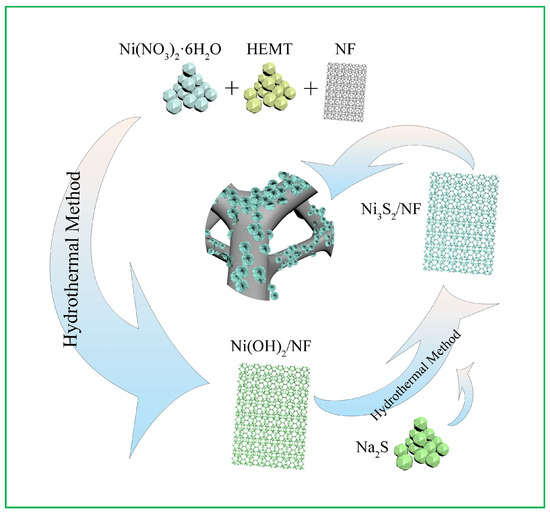 An overview of the fabrication strategy of hierarchical Ni3S2 NW on a 3D NF surface to construct a binder-free self-supported nanoarray is provided in Figure 1. This method first outlines the synthesis of Ni(OH)2/NF via a hydrothermal method. Next, Na2S acts as the sulfur source and S2− ions are released during the hydrolysis of Na2S. Ni2+ and S2− ions can easily combine to precipitate Ni3S2 under hydrothermal conditions [29]. Finally, Ni(OH)2 and Na2S react to form the Ni3S2 NW via the following reactions: