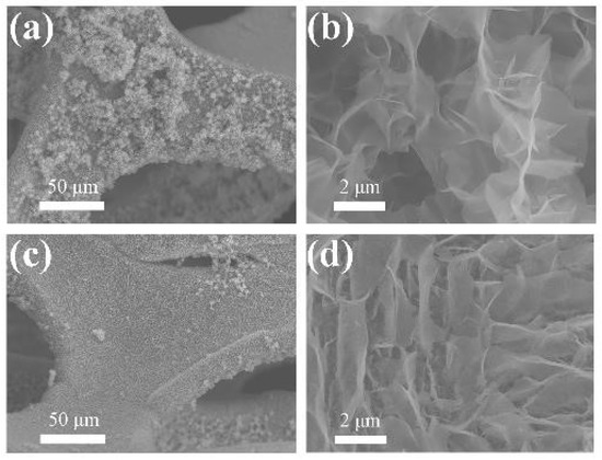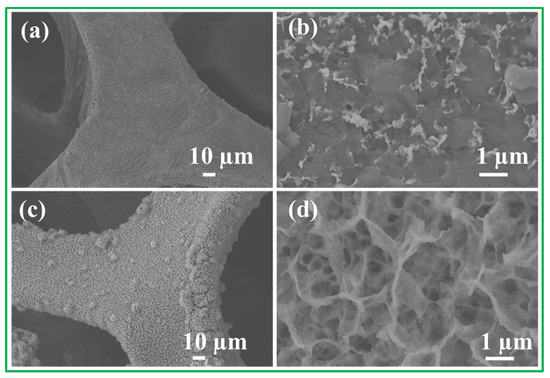 Scanning electron microscopy (SEM) images of (a,b) NiO/NF and (c,d) Ni3S2/NF.