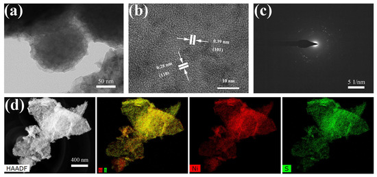 (a) Transmission electron microscopy (TEM), (b) high-resolution TEM (HRTEM), (c) selected-area electron diffraction (SEAD) pattern, (d) energy dispersive X-ray spectroscopy (EDS)–high-angle annular dark field images and the corresponding elemental mapping of Ni3S2.