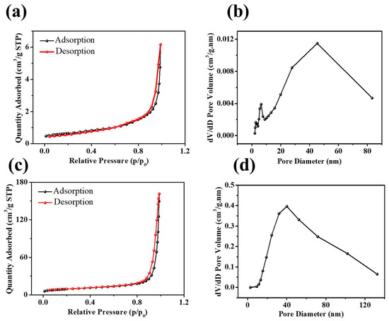 The surface area, pore types, and pore-size distributions of NiO and Ni3S2 were investigated based on nitrogen adsorption/desorption isotherms and the BJH pore-size distribution, as shown in Figure 5. The N2 adsorption/desorption isotherms of NiO and Ni3S2 indicate slit-like pores in the Ni3S2 mesoporous structure, as shown in Figure 5a,c. The specific BET surface areas of NiO and Ni3S2 were 2.2 and 32.3 m2 g−1, respectively, and their average pore sizes were 18 and 37.1 nm, respectively. Figure 3b,d show the BJH (the Barret, Joyner, and Halenda method) pore-size distributions of NiO and Ni3S2; the three main peaks at 2.7, 6.5, and 45.3 nm for NiO and the local peak at 40.0 nm for Ni3S2 indicate excess mesoscale pores in both NiO and Ni3S2. Ashkan et al. [32] studied the Li intercalation/deintercalation in bulk LiCoO2 and at the LiCoO2 (104) surface using DFT calculations and found that the diffusion barriers between the topmost second and third layers are lower than those in bulk LiCoO2. This finding indicated that nanosized LiCoO2 with a large surface area/volume ratio is a promising cathode material for fast charging/discharging Li–ion batteries. Wang et al. [33] also suggested that both the electrochemically active surface area and the internal structure contribute to the effective diffusion coefficient. Pseudocapacitors store electric charges via rapid and surface/near-surface controlled non-diffusion limited Faradaic redox reactions. According to Equation (3), a large ion-accessible surface area can generate high capacitance in a certain electrolyte [34].