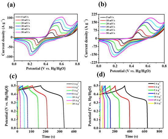 The peak current increases with the scanning rate, indicating that the electrode has high-rate capability [37]. Notably, the peak current value of Ni3S2 is higher than that of NiO because Ni3S2 has a dense lamellar structure (as shown in the SEM images in Figure 2), which is conducive to rapid electrolyte–ion transport. Figure 6c,d show the GCD curves of NiO/NF and Ni3S2/NF at different current densities (3–20 A g−1). The GCD curves of both materials exhibit Faraday capacitance characteristics; this finding agrees well with the CV results. Furthermore, the charge/discharge time increased from 332.2 s for NiO/NF to 639.2 s for Ni3S2/NF at 3 A g−1, indicating that the latter had a higher specific capacity. The specific capacity of the Ni3S2/NF electrode (255.3 mAh g−1) was much higher than that of the NiO electrode (138 mAh g−1) at a current density of 3 A g−1; even at a high current density of 20 A g−1, the Ni3S2/NF hybrid electrode still possessed a high specific capacity of 111.1 mAh g−1 (the specific capacity of the NiO/NF electrode was 26.7 mAh g−1), indicating the superior electrochemical performance of the Ni3S2/NF electrode (Figure 7d). During oxidation, the chemical state of S2− does not change, but valence transitions from Ni0 to Ni+ and further to Ni3+ occur sequentially. Hence, we inferred that the reversible Faradaic reactions of Ni3S2 in KOH aqueous solution can be attributed to the valence transitions of Ni0 in Ni3S2 between Ni0 and Ni3+. Therefore, according to the results deduced from both CV curves and XPS spectra, the two-step oxidation process and the three-step reverse-reduction process in the reversible Faradaic reaction proceed as shown in Equations (6) and (7), respectively [35]:
