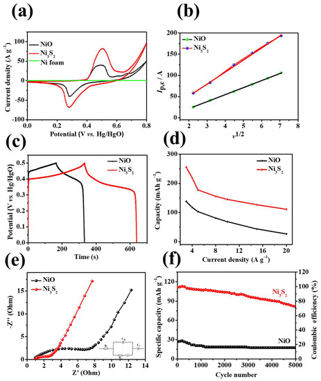 (a) CV curves and of NF, NiO/NF, and Ni3S2/NF at 10 mV s−1; (b) plot of the current density to the square root of the scan rate, (c) GCD curves at 3 A g−1, (d) specific capacity at various current densities, (e) EIS and (f) cycling performances of the NiO/NF and Ni3S2/NF electrodes.