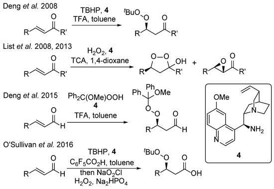 Despite their abundance in nature, methods for the enantioselective synthesis of chiral peroxides are still relatively scarce [12,13]. One approach with proven potential is the organocatalysed stereoselective peroxidation of unsaturated carbonyls. Asymmetric organocatalysis is an area of synthetic chemistry which is the focus of intense research, as evidenced by the many reviews on the topic since the early 2000s [14,15,16,17,18,19,20,21,22,23,24,25]. In particular, cinchona-derived organocatalysts have been successfully exploited by several groups for enantioselective peroxidations (Scheme 1) [26,27]. For example, List and Deng utilised a quinine-based catalyst for the asymmetric peroxidation of α,β-unsaturated ketones by the modification of a well-established epoxidation pathway utilising quinine-derived catalyst 4 [28,29,30]. Deng synthesised acyclic peroxides while List generated 1,2-dioxolanes and epoxides. More recently, Deng described the stereoselective peroxidation of α,β-unsaturated aldehydes [31]. In parallel work, our group investigated their asymmetric peroxidation with tert-butyl hydroperoxide (TBHP) followed by in situ Pinnick oxidation to afford stable β-peroxycarboxylic acids [32,33]. Outside of unsaturated ketone and aldehyde substrates, Russo and Lattanzi exploited a diaryl-2-pyrrolidinemethanol-derived catalyst to produce enantiomerically-enriched β-peroxynitroalkanes from nitrostyrenes [34]. The stereoselective peroxidation of unsaturated aromatic and aliphatic nitroalkenes has likewise been reported [35].