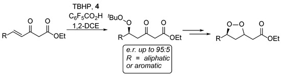 β-Keto esters constitute highly versatile building blocks in organic synthesis which can be readily modified through a wide variety of transformations [36,37,38,39,40,41,42]. To date, β-keto esters have been mostly employed as nucleophiles in organocatalysed reactions [43]. We are aware of only one report of a quinine-mediated addition of nitroalkanes to an α,β-unsaturated β-keto ester [44]. The main aim of this work is the development of a methodology for the asymmetric peroxidation of γ,δ-unsaturated β-keto esters (Scheme 2). This chemistry could open up a concise route to chiral 1,2-dioxolane-3-acetic acids, a recurring motif in several bioactive natural products.
