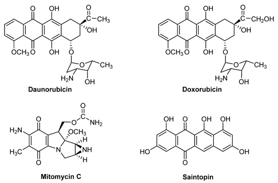 Quinones are ubiquitous in nature and their scaffolds are present in many drugs such as anthracyclines, daunorubicin, doxorubicin, mitomycin, mitoxantrones and saintopin (Figure 1). Some of them are used clinically in the therapy of solid cancers. The cytotoxicity of these quinones is typically caused by inhibition of DNA topoisomerase-II and/or the formation of reactive oxygen species (ROS), generated during quinone redox cycling [1]. The most important and widely distributed chemical class in the quinone family is that of 1,4-naphthoquinones. Their biological activities, particularly against cancer cells, have motivated many studies focusing on the development of novel antitumor agents based on the 1,4-naphthoquinone array [2,3,4,5]. In line with the necessity of alternatives drugs in cancer therapy, quinones are important tools in the search for intracellular targets that play a role in cancer cell survival.