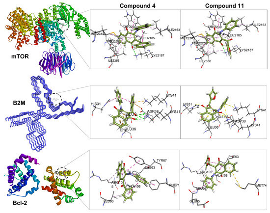 Molecular docking visualization for compounds 4 and 11 bound to mTOR, B2M and Bcl-2. It shows the surrounding amino acid residues in the binding pocket of proteins within 4.0 Å. The dashed lines indicate attractive interactions. Hydrogen atoms have been removed for clarity.