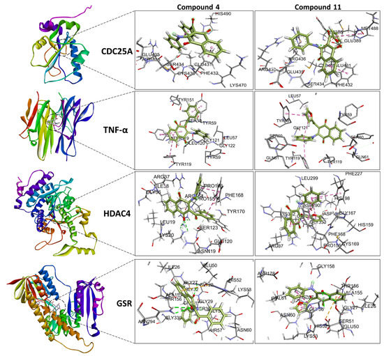 Molecular docking visualization for compounds 4 and 11 bound to CDC25A, TNF-α, HDAC4 and GSR. It shows the surrounding amino acid residues in the binding pocket of proteins within 4.0 Å. The dashed lines indicate attractive interactions. Hydrogen atoms have been removed for clarity.