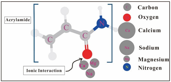 Based on the analysis of the molecular structure of HPAM, the molecular structure is flexible chain and the molecular state is random coil. The multiple charges are distributed on the molecular chain of HPAM making HPAM a polyelectrolyte solution [62]. When low concentration salt is added to HPAM, the molecular chain is greatly extended, showing high viscosity. The strength of solution ions increases with the increase in salt concentration, and the low molecular opposite ions penetrate the macromolecule opposite ions. This behavior shields the effective charge and causes the polymer chain to shrink, resulting in a rapid reduction in viscosity [63]. When CaCl2 and MgCl2 are added, the viscosity of HPAM solution decreases sharply with the increase in salt concentration. This is because with the increase in high valence ions, the hydrophobic association is electrostatically shielded by the counter charge, and the molecular chain curls. The structure of the association network in the solution is destroyed, which reduces the viscosity of the solution. With the increase in divalent cation mass concentration, the divalent cation has stronger ion-dipole interaction with the amide group, which weakens the bond strength of N-H and C=O; the ionic bond reaction is shown in Figure 1 [64]. The above reasons reduce the electrostatic repulsion on the polymer chain and reduce the hydrodynamic radius of HPAM macromolecules, and the macromolecular coil shrinks, resulting in a gradual decrease in the viscosity of the polymer solution [65,66]. Yang et al. also confirmed this view in the performance experiment of crosslinked polyacrylamide microspheres [67]. Figure 2 shows the structural changes of the HPAM flexible chain. This is because as the salt concentration increases, the electric double layer and hydrolysis layer on the HPAM molecular chain are thinned by the externally strengthened electrolyte, and the repulsion of the charge on the macromolecule main chain of the macromolecule is weakened, causing the molecular chain to curl and the size to be small. Al3+ is prone to intramolecular crosslinking with COO- on the same polymer molecule, forming a large number of linked polymer coils [68].