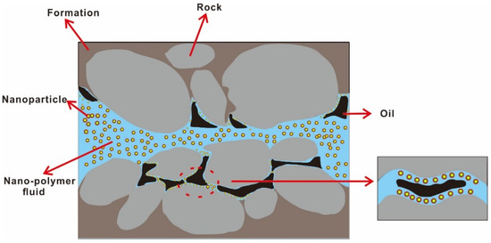 Polymer flooding is a tertiary oil recovery method, which is one of the most widely used tertiary oil recovery methods [92]. However, polymers are limited by relative molecular mass and molecular structure. This method cannot adapt to complex reservoirs such as high temperature, high salt, low porosity and low permeability because of its poor comprehensive performance, which affects the improvement of oil recovery [93]. Nanoparticles have a series of favorable characteristics such as small size, high surface and interface activity, easy chemical modification and thermal stability [94]. The nanoparticle reinforced polymer is created by introducing nanoparticles into the polymer, such as silica, nano alumina, titanium oxide, nickel oxide, etc. Nanoparticles are bonded to polymer molecules by hydrogen bonding or other intermolecular forces, and the stability of the nanoparticle-polymer composite structure is enhanced. Combined with the characteristics of nanoparticles, the viscosity, temperature resistance, salt resistance and shear resistance of polymers can be improved. Therefore, nanoparticle-polymer fluid is a kind of oil displacement system with broad application prospects. Figure 3 shows the displacement diagram of the nanoparticle-polymer fluid during oil displacement [95]. Table 1 summarizes the effects of polymer and nanoparticle-polymer on IFT, contact angle and oil recovery.