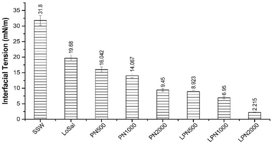 Interfacial tension refers to the surface free energy between two immiscible liquids, which determines the distribution of fluids in the formation. Reducing IFT is one of the ways to enhance oil recovery. This is because the distribution and flow of crude oil in the reservoir are affected by capillary forces. The oil droplets in the rock can have a good flow when the capillary number reaches a certain value, and the capillary force depends on the interfacial tension between the fluid phases [132,133]. Interfacial tension is very important for reducing the capillary force and increasing the capillary number, and it is one of the key parameters for enhancing oil recovery [134]. Ultra-low interfacial tension can greatly increase the capillary number and reduce the binding strength of the rock to the crude oil when the IFT is reduced to 10−3 mN/m, and the flow velocity of the remaining oil in the reservoir is significantly increased [135]. The relationship between capillarity force and interfacial tension parameters is shown in the following equation [136]: