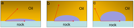 Wettability, like interfacial tension, is also one of the important parameters for enhanced oil recovery. It plays a key role in reservoir evaluation and dynamic analysis. It reflects the microscopic distribution of residual oil and original fluid in the reservoir. Wettability is defined as “the tendency of one fluid to spread on or adhere to a solid surface in the presence of other immiscible fluids” [140]. The reservoir rocks may exhibit different wettability, which may be oil-wet, water-wet, or medium-wet, and this wetting behavior depends on the interaction between the rock and the crude oil. The contact angle is a key index to measure wettability. The wettability shows absolute hydrophilia when the contact angle is 0°; it is water-wet when the contact angle is between 0° and 60°; it is medium-wet when the contact angle is between 60° and 90°; it is oil-wet when the contact angle is between 90° and 180°; it shows absolute lipophilia when the contact angle is 180°, as shown in Figure 11.