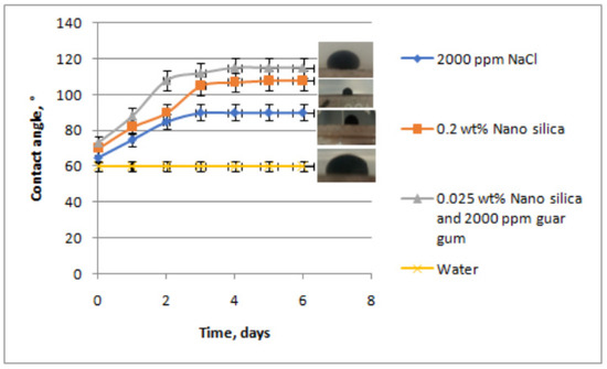 Bila’s research shows that polymer-coated silica nanoparticles can alter the wettability of oil and rock, and the contact angle decreases from 143.30° to 48.75° with the addition of silica nanoparticles [121]. The interaction between ionic bonds produces new surface roughness leading to the interface energy between rock and water being lowered and so the oil film on the surface is destroyed. In addition, the contact area of nanoparticles is large, thus forming a wet surface. Figure 13 shows the curves of contact angle with time for the four tested solutions and the corresponding photographs of the oil drops. Analysis of the data shows that a silica and guar gum polymer solution can effectively convert surfaces from lipophilic to hydrophilic. Silica nanoparticles are easily adsorbed in sandstone when guar gum and silica are mixed as a displacing fluid, which is very active in influencing the contact angle and helps to improve wettability [100].