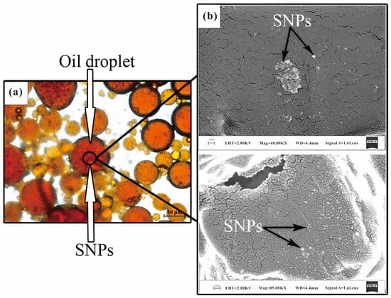 Image of deposition of nanoparticles on oil droplets in a 5000 ppm XG-0.3 wt% SNPs nanoparticle-polymer fluid: (a) microscope analysis (b) FESEM analysis [6].