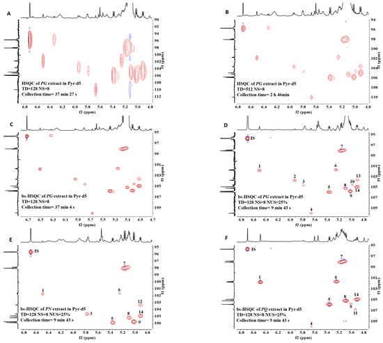 Comparison of HSQC and bs-HSQC NMR (500 MHz, Pyr-d5) spectra. All spectra had a NS (number of scans) of 8. The TD of all bs-HSQC was 128. (A) HSQC without NUS of PG extract. TD = 128, acquisition time was 37 min 27 s. (B) HSQC without NUS of PG extract. TD = 512, acquisition time was 2 h 46 min. (C) Bs-HSQC without NUS of PG extract. TD = 128, acquisition time was 37 min 7 s. The results showed that bs-HSQC produced high-resolution spectra in a shorter time. (D) Bs-HSQC with 25% NUS of PG extract. (E) Bs-HSQC with 25% NUS of PN extract. (F) Bs-HSQC with 25% NUS of PQ extract. Introducing 25% NUS reduced the acquisition time to 9 min 43 s. The numbers in the spectra (D–F) correspond to No. in Table 1, indicating peak attribution.