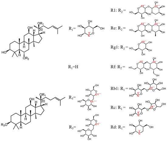 Main ginsenosides in Panax Linn. The attributed anomeric carbons were highlighted in red.