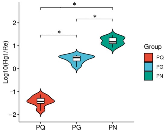 According to a previous report [10], the ratio of ginsenoside Rg1 to Re in PQ, PG, and PN varies, which can be regarded as an index to distinguish the species. Our work showed that the integral ratio of ginsenoside Rg1 to Re (Rg1/Re) was obviously different (Figure 3; the integral ratio was in Table S3). The t-test revealed that the p-values of log10(Rg1/Re) between any two groupswere all significant (p-values < 0.01). Therefore, the integral ratio of Rg1 to Re can also serve as an index to distinguish PQ, PG, and PN.