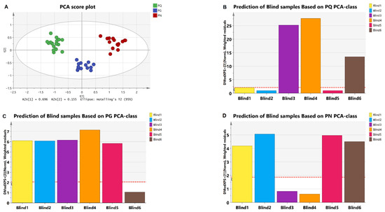(A) The PCA score plot of PQ, PG, and PN samples. The color green represents PQ, blue represents PG, and red represents PN. (B) The prediction of blind samples based on PQ PCA-class. The blind samples 1, 2, and 5 were lower than Dcrit. (C) The prediction of blind samples based on PG PCA-class. The blind sample 6 was lower than Dcrit. (D) The prediction of blind samples based on PN PCA-class. The blind samples 3 and 4 were lower than Dcrit. The red dotted line indicates Dcrit at 95% significance level. When the Mahalanobis distance for a certain sample was lower than Dcrit of that model, the sample was considered positive. Colors represent different samples. The horizontal axis represents the sample name.