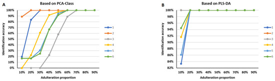 The results of identification accuracy for simulative adulterated samples at the mixing signal level. The colors represent different adulterated samples. The horizontal axis represents the proportion of adulterants. The vertical axis represents the identification accuracy. (A) The identification accuracy based on PCA-class. (B) The identification accuracy based on PLS-DA, which had better results with higher identification accuracy for low-adulteration ratio than PCA-class. For both PCA-class and PLS-DA, the accuracy of identification increased as the proportion of adulterant increased. 1: The identification accuracy of PQ adulteration mixed with PG in 9 proportions; 2: The identification accuracy of PQ adulteration mixed with PN in 9 proportions; 3: The identification accuracy of PG adulteration mixed with PQ in 9 proportions; 4: The identification accuracy of PG adulteration mixed with PN in 9 proportions; 5: The identification accuracy of PN adulteration mixed with PQ in 9 proportions; 6: The identification accuracy of PN adulteration mixed with PG in 9 proportions.