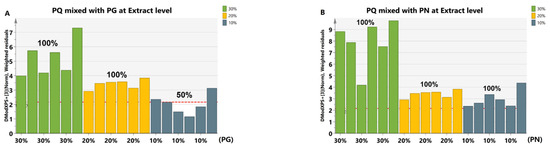 The noise and signal drift during sample collection may cause the mixed signal to be unable to completely reflect the signal of the actual adulteration at extract level. So, we took actual adulterated PQ extract for verification of the developed method. Two types of adulterated samples were prepared by mixing PQ with PG or PN. The proportions of adulterant were 10%, 20%, and 30%, with six samples for each proportion. A total of 36 samples were analyzed (Table S6). The results showed that the identification accuracy was 100% when 20% PG (Figure 6A) or 10% PN (Figure 6B) were added separately, whose identification trend was basically consistent with the discrimination of simulative adulterated samples (Lines 1, 2 in Figure 5A).