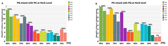 The identification results of adulterated samples at the herb level. (A) The identification results of PQ mixed with PG in 9 proportions. There were two samples for each proportion. All samples were found to be higher than Dcrit. (B) The identification results of PG mixed with PQ in 9 proportions. There were two samples for each proportion. Two 90% PG + 10% PQ and one 80% PG + 20% PQ samples were lower than Dcrit. Other samples were found to be higher than Dcrit. The red dotted line indicates Dcrit at 95% significance level. When the Mahalanobis distance for a certain sample was lower than Dcrit of that model, the sample was considered positive. Different colors represent adulterated samples mixed with different proportion of adulterant. The horizontal axis represents the adulteration proportion. The percentage on the column represents the identification accuracy.