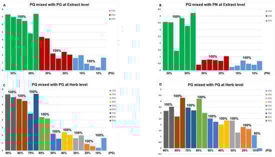 The identification results of adulterated samples based on the corresponding PLS-DA model. (A) PQ ginsenosides extract mixed with that of PG in 3 proportions. There were two samples for each proportion, and all columns were greater than 0. (B) PQ ginsenosides extract mixed with that of PN in three proportions. There were six samples for each proportion, and all columns were greater than 0. (C) PQ herb mixed with PG in nine proportions. There were two samples for each proportion, and all columns were greater than 0. (D) PG herb mixed with PQ in nine proportions. There were two samples for each proportion. One column for 90% PG + 10% PQ was lower than 0, which means that the result was negative, and other columns were greater than 0. When the column for a certain sample was greater than 0, the sample was considered positive (adulterated samples). Different colors represent adulterated samples mixed with different proportion of adulterant. The horizontal axis represents the adulteration proportion. The percentage on the column represents the identification accuracy.